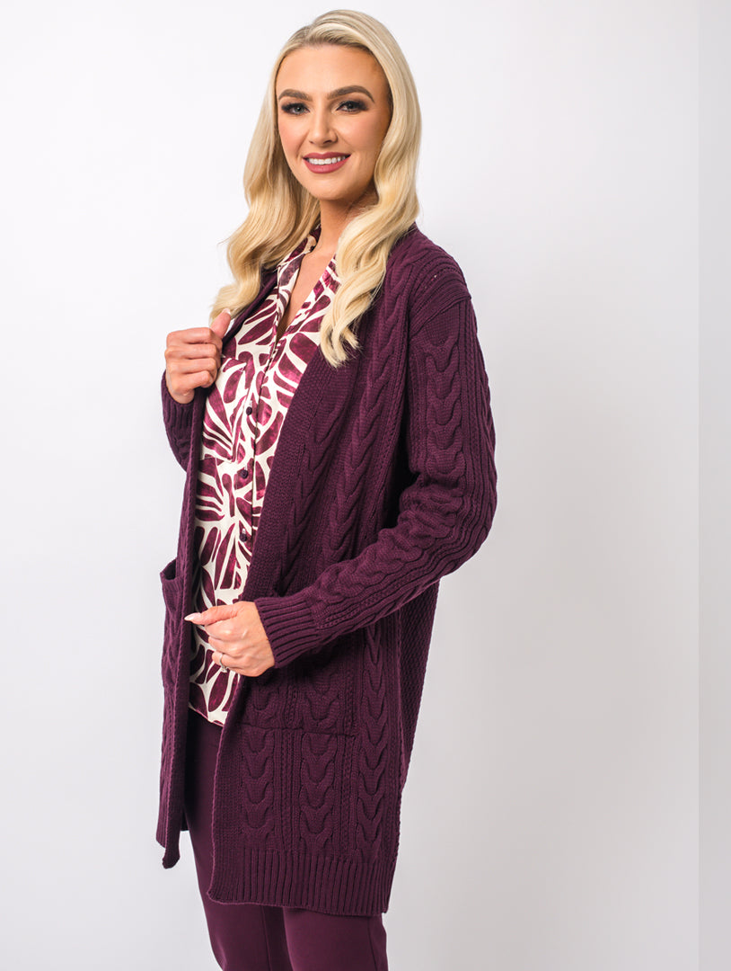 Long line 2 pocket Cardigan. Cable knit. Great layering piece for the Autumn months. Pair with our Matching Lily trousers.