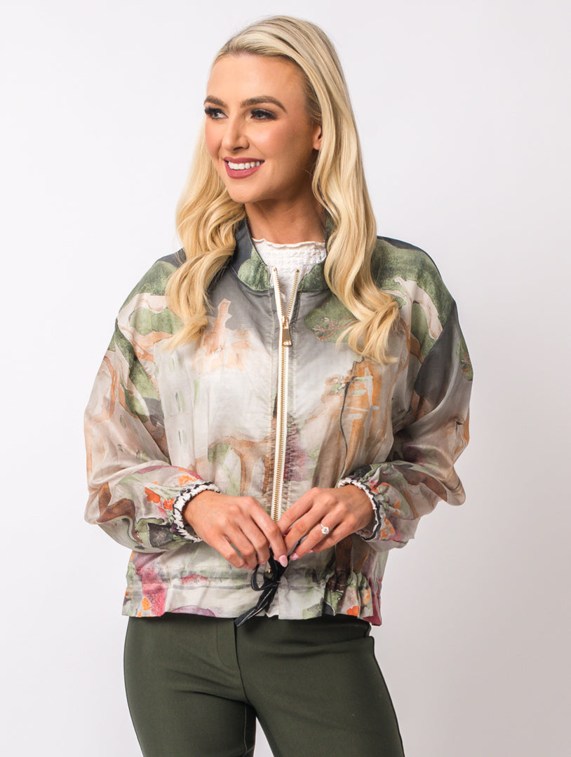 Zip up printed Jacket. Lightweight fabric. Elastic cuff. Great layering piece for the transition from Summer to Autumn.