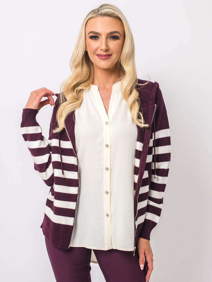 Soft Touch Wine and White Striped Zip-Up Knit with hood – a cosy and casual piece perfect for layering and matching with our Wine Lily Trousers this season.