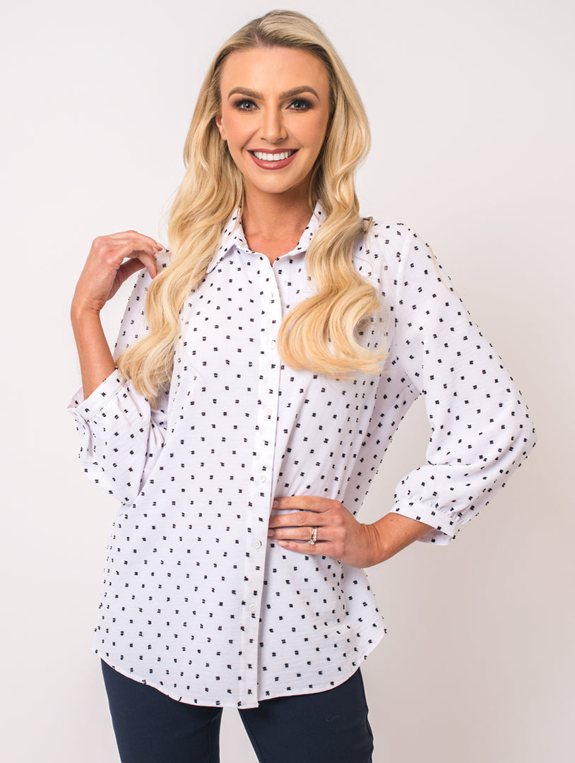 Polka dot style 3/4 sleeve blouse. Versatile piece. Perfect for this season.