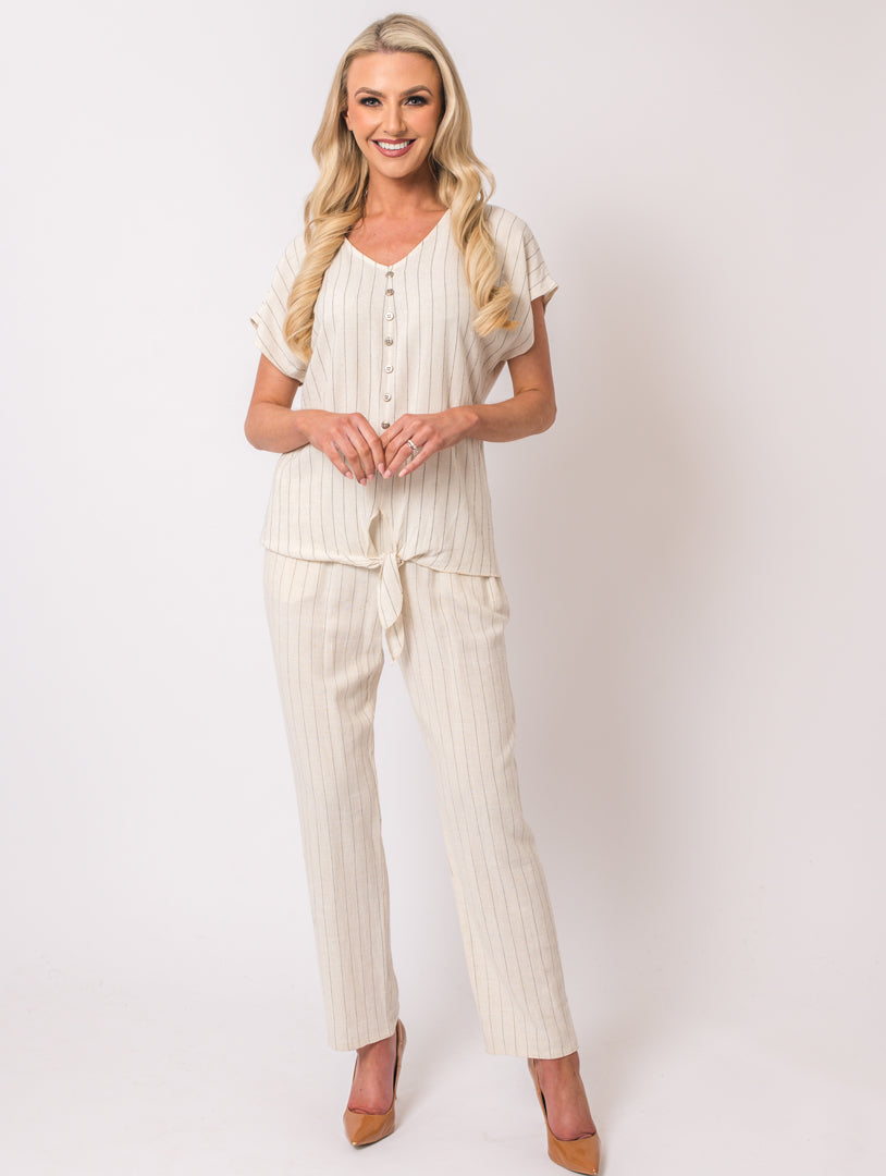A short-sleeve V-neck top made from soft viscose. Designed with a striped fabric, silver button detailing at the front, and a tie accent for an easy, feminine finish.